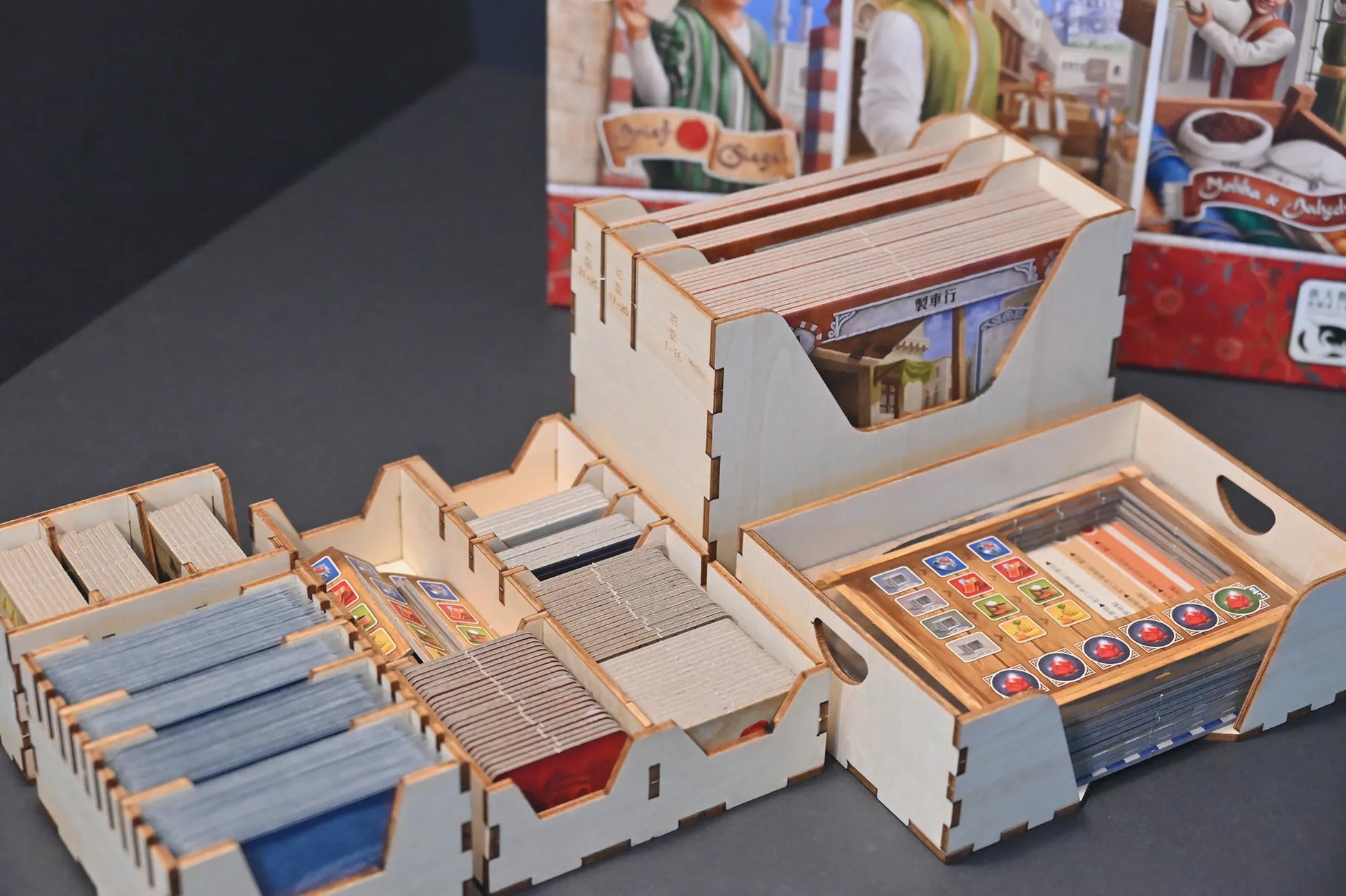 適用《伊斯坦堡大盒版》Istanbul Big Box的桌遊收納盒。一個地點板塊收納盒,可依照地點編號分類,可快速區分主遊戲及兩個擴充地點。兩個圖板收納盒,將需求圖板、清真寺圖板、販售亭圖板、信件圖板、酒館圖板皆分類分格整理。五位玩家的配件一人一盒;錢幣、咖啡、紅寶石分裝兩個小盒,遊戲時方便不同座位的玩家拿取。最後,卡牌收納盒空間支援厚套卡牌,並附有隔板分類卡牌。本收納盒組裝免用膠水,支援豎放遊戲盒。