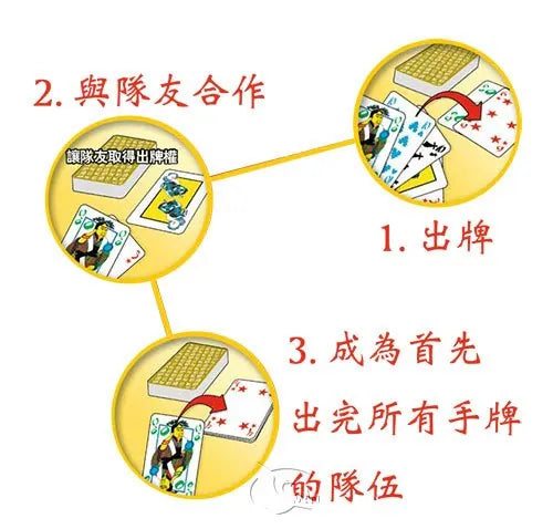 這是一個規則介於橋牌及大老二的遊戲,但內容與牌卡皆相異,玩家亦可以合作的方式,可交換牌或互惠以聯合獲得分數。