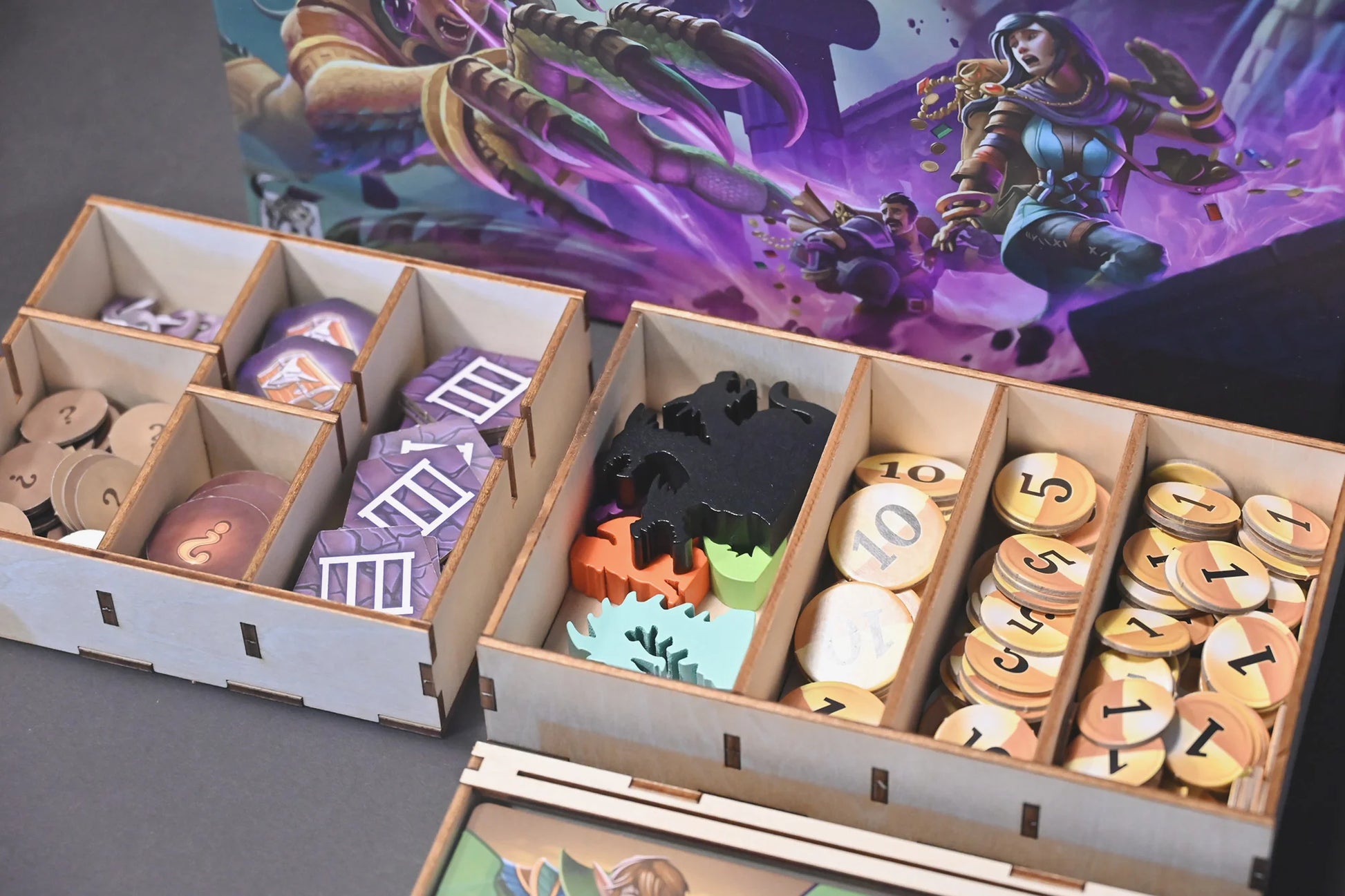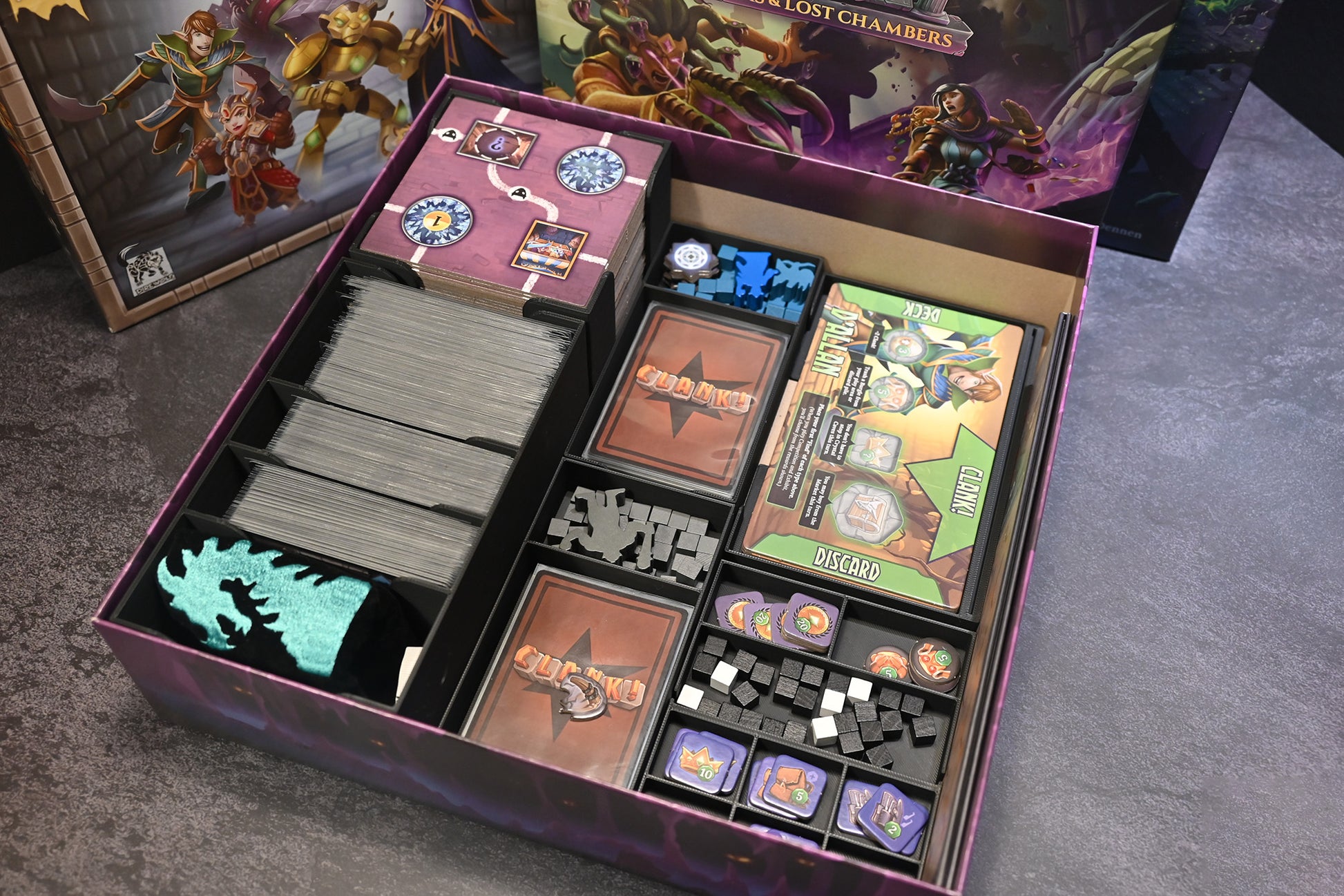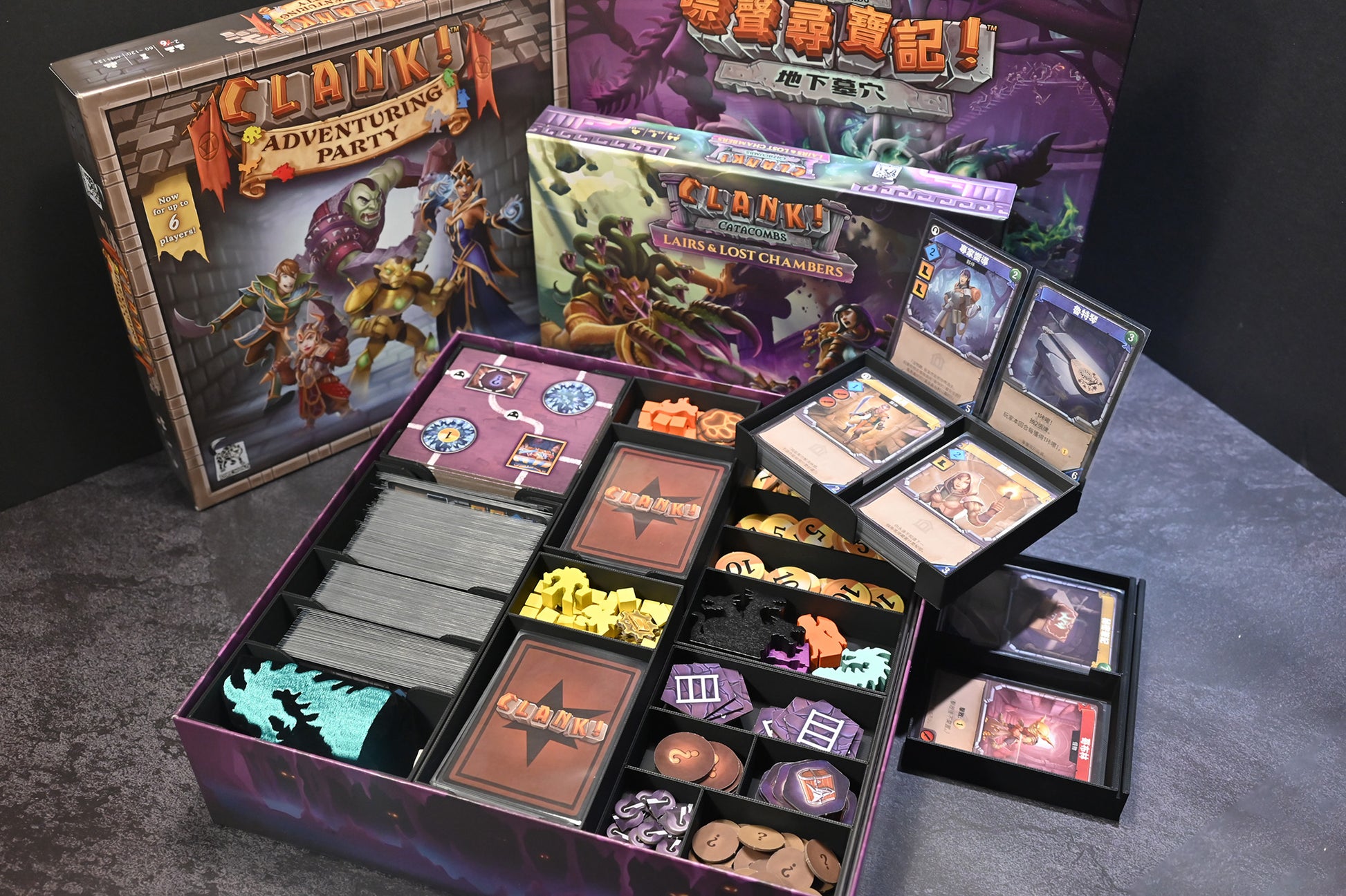 《噤聲尋寶記地下墓穴 Clank! Catacombs》桌遊收納盒可收入主遊戲以及《冒險小隊 Adventuring Party》、《巢穴與密室 Lairs and Lost Chambers》兩個擴充。