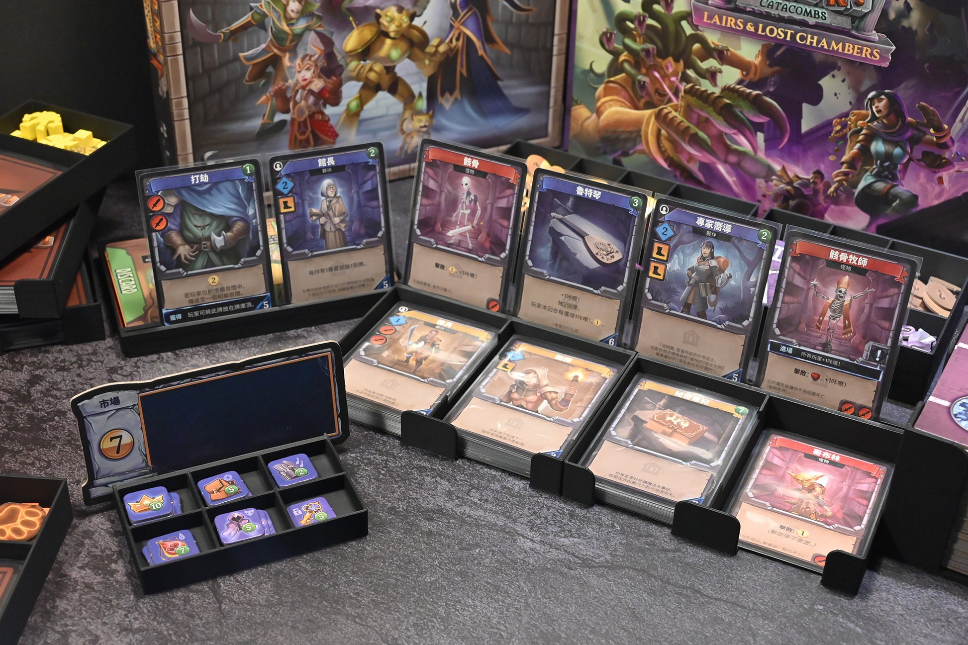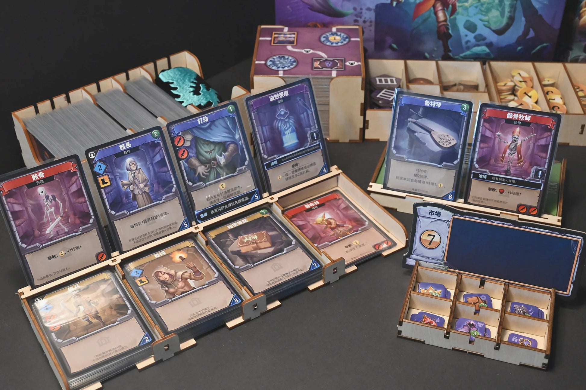 兩個牌架預先設置好儲備卡牌區,並附有卡槽來展示其餘的地下城卡牌。收納盒空間支援使用厚牌套的卡牌。