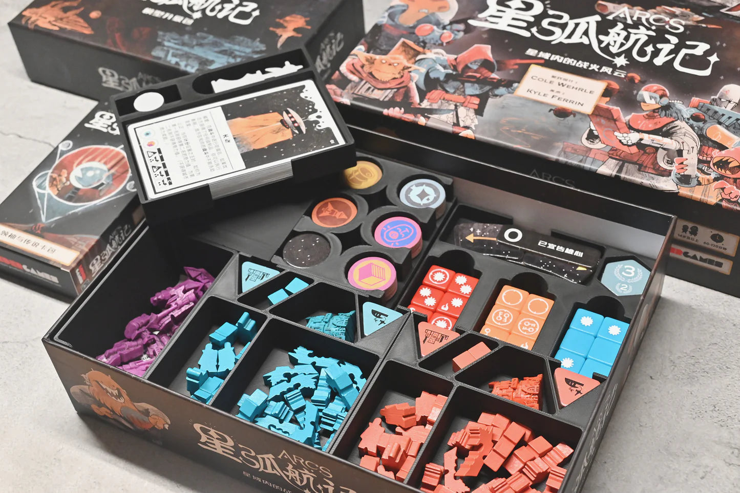 適用《星弧航記》Arcs 的3D列印桌遊收納盒,能一併收入《領袖與傳說卡包 Leaders & Lores Pack》以及模型升級包。