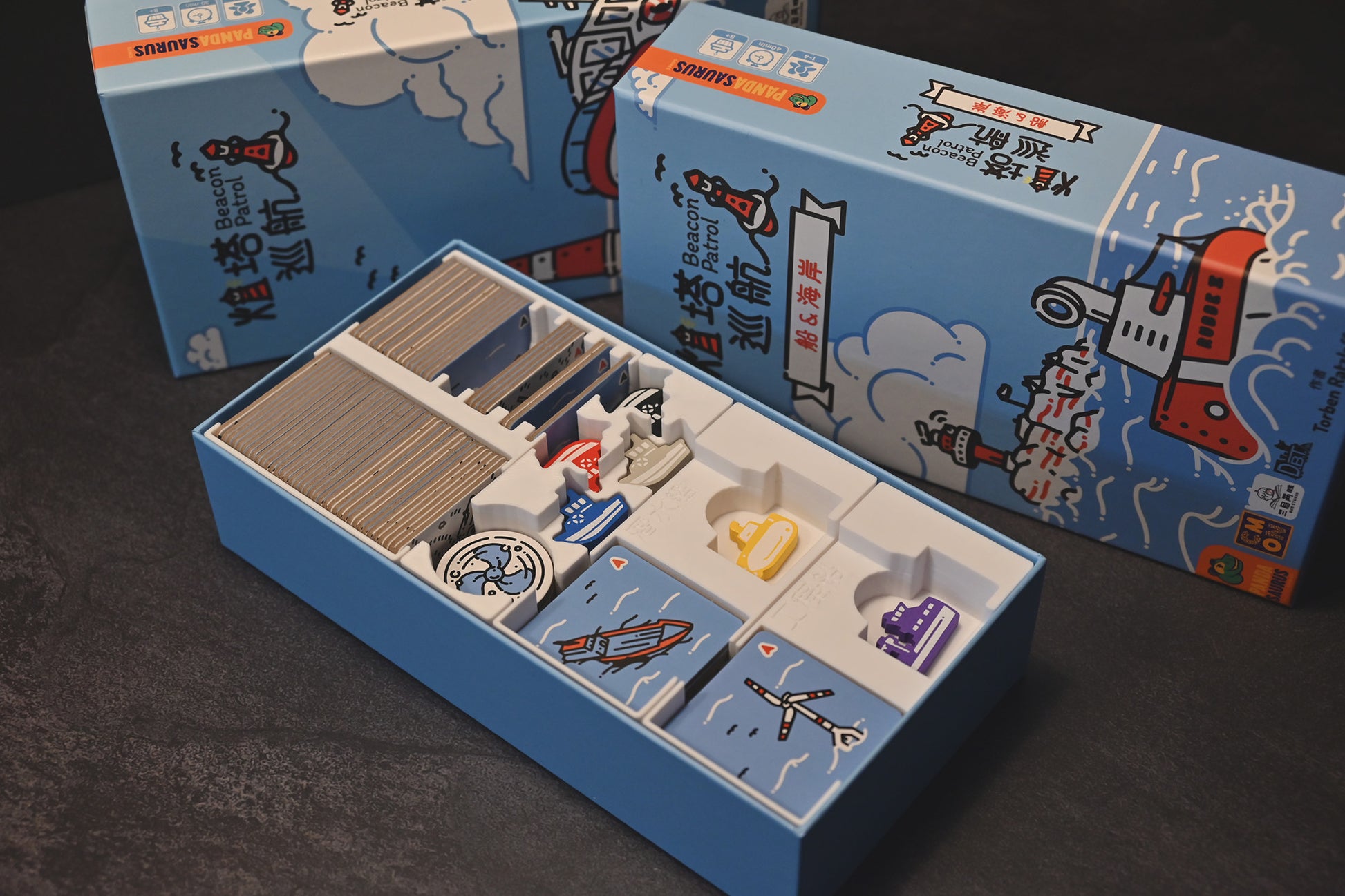 《燈塔巡航 Beacon Patrol》3D列印桌遊收納盒可將主遊戲和《船與海岸 Ships & Shores》擴充一併收入,節省架上空間。