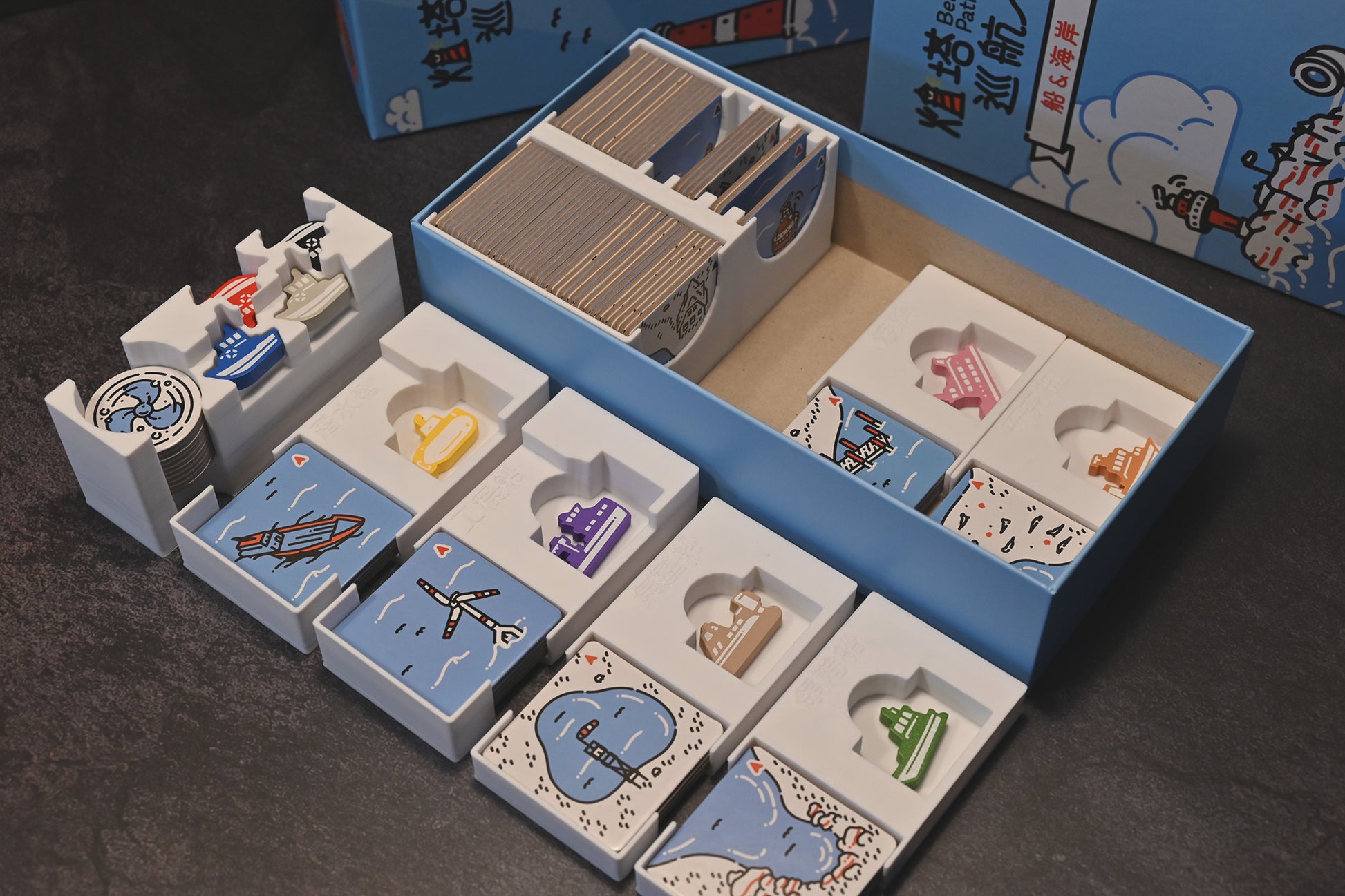 擴充的六艘新船有各自的收納小盒,擺放船米寶以及該船隻設置所需的板塊。板塊盒將基礎遊戲、小擴、起始板塊等分隔擺放,除了整齊收納外,也可加速遊戲設置和清理時間。