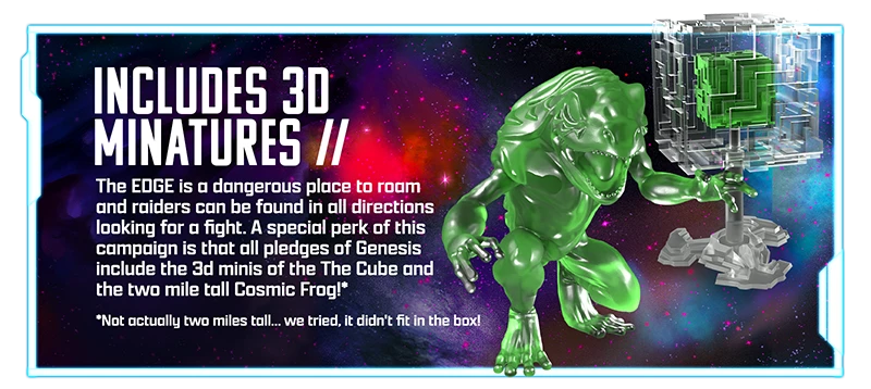 Genesis includes three new factions (Martian Terraformers, Precog Hybrids, Wood Whisperers), two new foes to face (Cosmic Frog, The CUBE), new regions such as the Cosmic Swamp, the Innovation Hub, Corrupted Stars (Sia and Ceti Alpha), and six half tile Ancient Shrines! The expansion introduces a new event deck (Persistence of Memory), 15 new development abilities and an exciting deck of exotech cards allowing you permanent effects, the ability to control raiders and more!