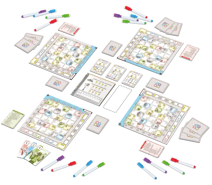 En Route is a flip-and-write game in which you create tour routes to the most interesting landmarks of the real-world cities (London, New York City, Hong Kong, Paris, Cairo, and Rio de Janeiro) and the made-up First City packed full of geek references. Every city features basic and specific mechanisms, so all of them play and feel differently.