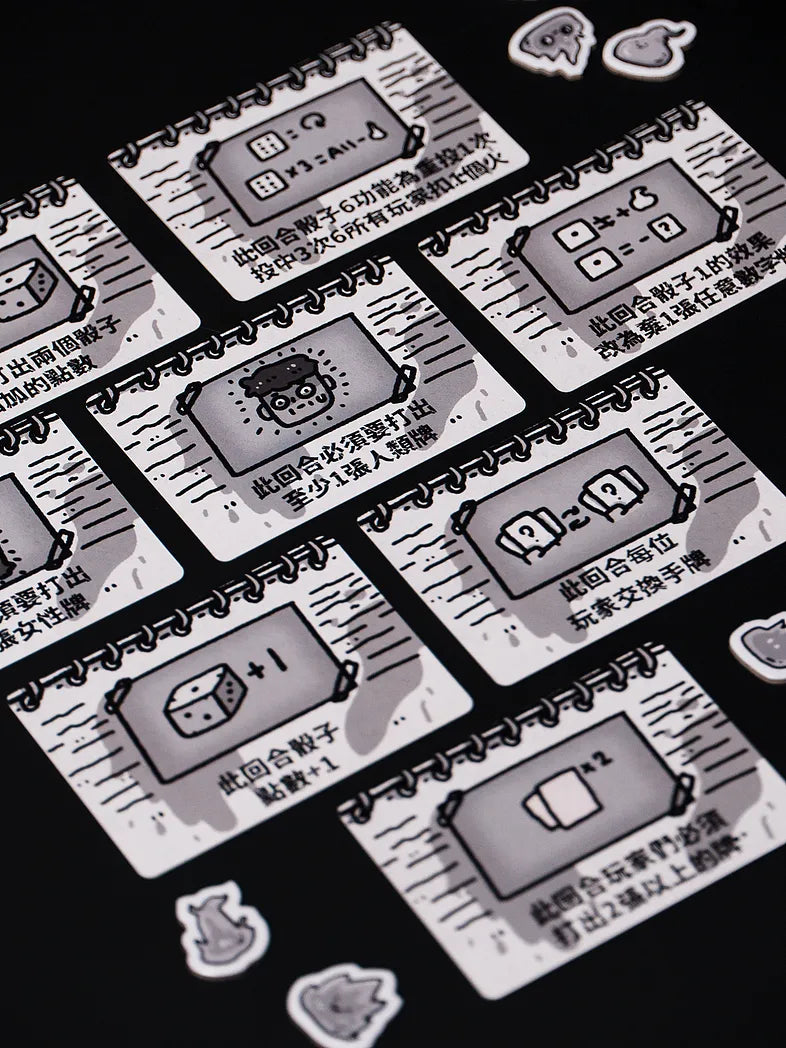 每位玩家各自8張手牌.玩家電根據骰子的黑佔數打出卡牌!