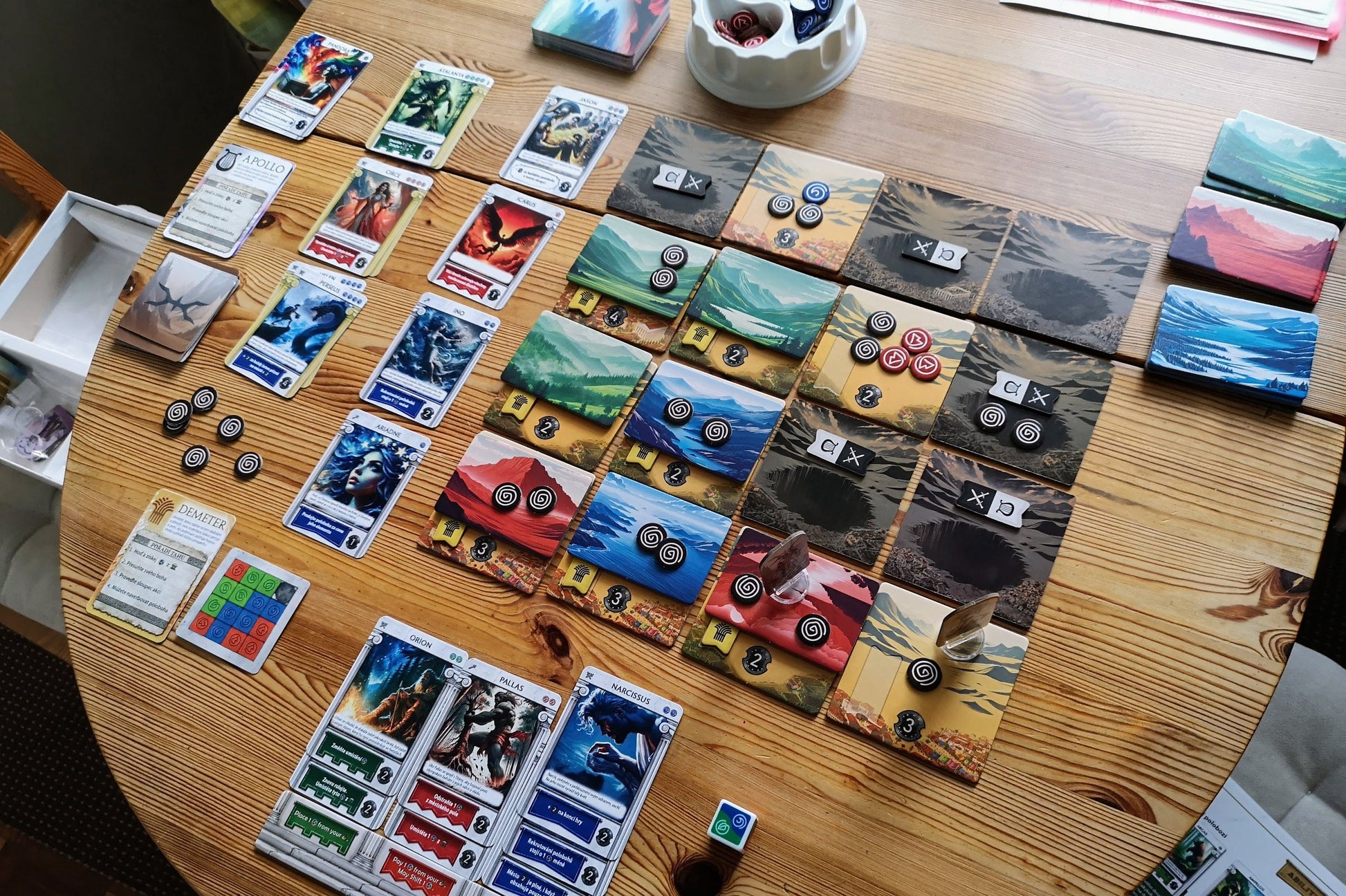 Combine Area Control mechanics by moving your god around the map to influence different areas and an Engine Building system of recruiting powerful Demigods to augment and enhance your abilities each turn. The winner is the player who can score the highest by reshaping the world to according to their secret plan and hiring powerful Demigods.