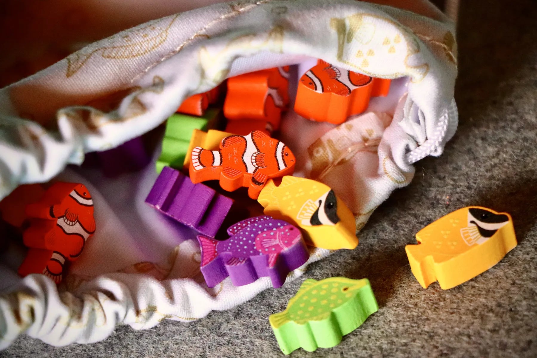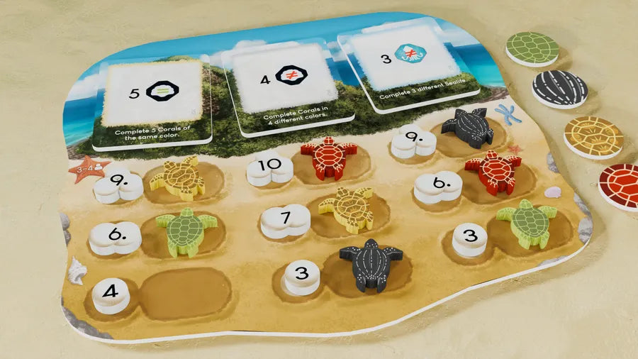 On your turn, choose tiles showing fish, coral, or sea life, and place them on an empty space on your board. When fish surround a coral of the same color, you flip over the completed coral, which becomes a home for fish. Choose which fish will inhabit the coral, keeping the puzzle and ecosystem cards in mind. Use seashells to lure fish and move them, ideally completing multiple coral at once if you build them strategically.