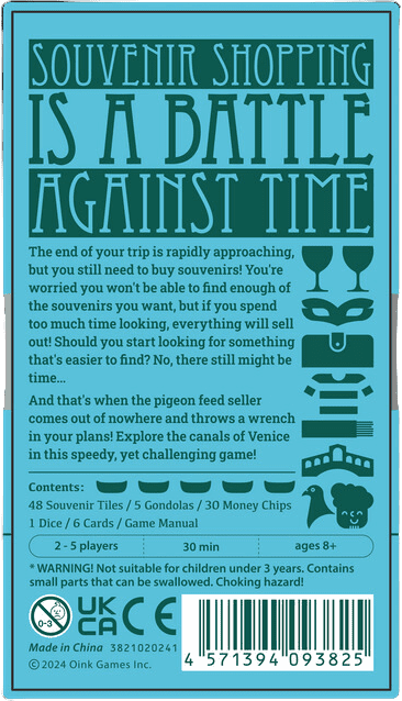 On a turn, roll the die, move your gondola, then see what you want to purchase. Souvenirs come in six types, with 5-10 copies of each type, and to score points, you need to collect three of the same type. Find the "Pigeon Feed Seller", and you must trade one of your souvenirs with a neighbor.