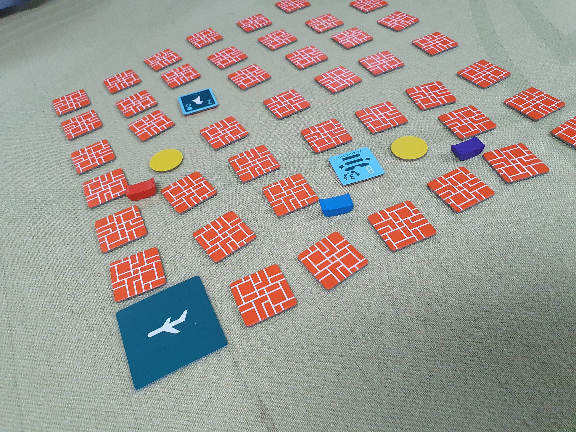 To set up, lay out the tiles face down in a grid on the table. Each player has a small gondola that will sail between the rows of tiles.