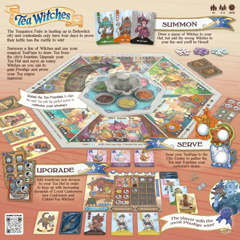In the service phase, players take turns sending their adorable TeaPups to various Bootiques in the city to gather toppings and collect tea from the rotating crystal fountain in order to serve witches waiting at their hut. Additionally, TeaPups can help players collect powerful upgrades, attract Celebri-teas, and brew up Special-Teas with bonus abilities. Clever TeaPup placement can also help you complete to-go orders for witches out and about in the city center.